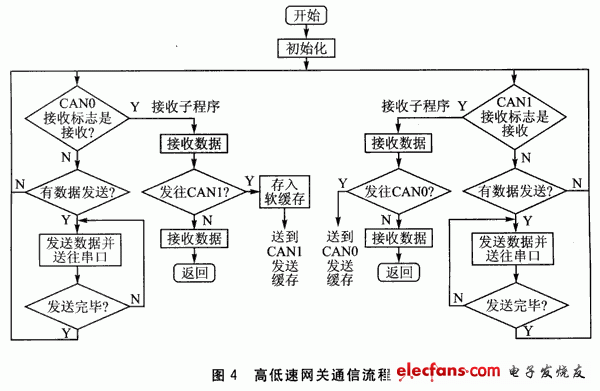 由于傳輸速率不同,高低速CAN網(wǎng)絡(luò)之間的數(shù)據(jù)傳輸是不同的。當(dāng)高速CAN網(wǎng)絡(luò)數(shù)據(jù)向低速CAN傳輸時(shí),生需要加入軟緩存暫時(shí)存儲(chǔ);當(dāng)?shù)退貱AN網(wǎng)絡(luò)數(shù)據(jù)向高速CAN網(wǎng)路數(shù)傳輸時(shí),可直接傳輸。通信流程如圖4所示。