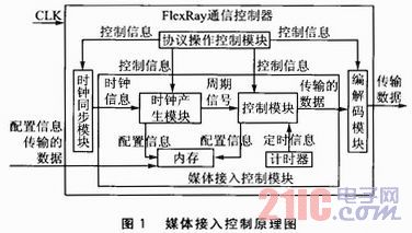 時(shí)鐘產(chǎn)生模塊根據(jù)用戶的配置信息,對(duì)控制器晶振產(chǎn)生的最小時(shí)鐘節(jié)拍按照協(xié)議規(guī)定形成系統(tǒng)所需要的時(shí)鐘周期;控制模塊根據(jù)用戶配置的信息將時(shí)鐘周期進(jìn)一步劃分為4個(gè)獨(dú)立的段,即靜態(tài)段、動(dòng)態(tài)段、符號(hào)窗口、網(wǎng)絡(luò)空閑段;計(jì)時(shí)器模塊根據(jù)用戶配置信息實(shí)現(xiàn)計(jì)時(shí)功能,用來記錄媒體接入控制所需要的時(shí)間。