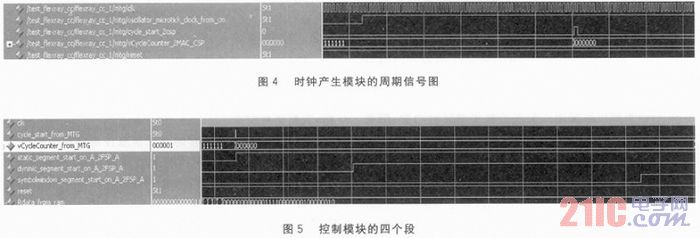圖4是時(shí)鐘產(chǎn)生模塊的周期信號(hào)圖。從圖中可以看到,時(shí)鐘產(chǎn)生模塊需要等待晶振的最小時(shí)鐘節(jié)拍信號(hào),然后進(jìn)行判斷產(chǎn)生周期信號(hào)。當(dāng)周期信號(hào)開始時(shí),周期編號(hào)從默認(rèn)的63變?yōu)?,然后一直編號(hào)下去直到63。