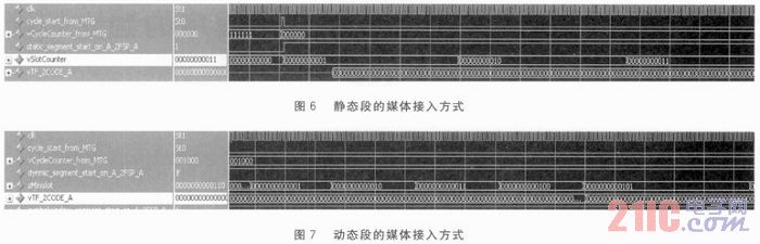 圖6是靜態(tài)段的媒體接入方式。從圖中可以看到,槽計(jì)數(shù)器(vslotcounter)從1開始編號(hào)直到用戶配置的值。在第一個(gè)靜態(tài)槽實(shí)現(xiàn)了媒體接入。
