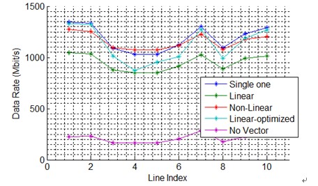 同VDSL2一樣,實際應用中G.fast的性能也會受到線間串擾的影響。如果沒有Vectoring技術配合,G.fast速率將嚴重下降。圖1是基于100米實際線纜參數的G.fast速率仿真結果,個別線纜可以達到1.3G速率。但如果存在串擾且沒有Vectoring,速率將急劇下降到200M左右。這是因為G.fast工作頻率非常高,線間串擾的影響比VDSL2更大,因此G.fast必須采用更加先進的Vectoring技術進行線間串擾抵消。