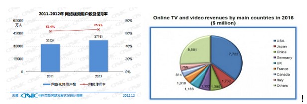 圖1:2013.1 CNNIC 中國互聯(lián)網(wǎng)調(diào)查報告 圖2:2012年Digital TV Research調(diào)研