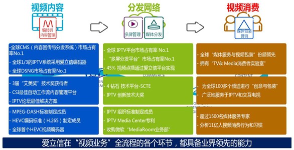 愛立信的電視解決方案事業(yè)部業(yè)務(wù)遍及全球,在英國、美國、中國等地設(shè)有研發(fā)機(jī)構(gòu)。通過不斷的技術(shù)研發(fā),業(yè)務(wù)拓展,和一些重要的并購,如Tandberg Television(視頻壓縮,互動(dòng)電視后臺),Hyc TV(視頻產(chǎn)業(yè)咨詢),Technicolor(廣播管理服務(wù)),微軟Mediaroom(全球IPTV市場份額第一),Redbee(媒體服務(wù)提供),愛立信已經(jīng)成為電視和媒體(TV&Media)領(lǐng)域領(lǐng)導(dǎo)者,能夠?yàn)闃I(yè)內(nèi)提供完整的端到端整體解決方案和服務(wù)。