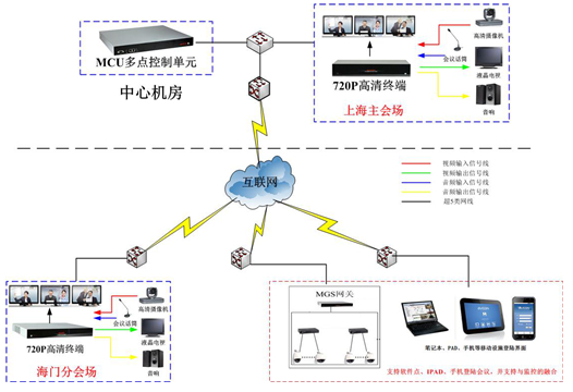 1、系統采用軟硬件結合的模式。主要的會場采用硬件設備,保障系統穩定運行;經常出差的與會者不在會議室,用PC、智能手機、PAD、無線終端也能同樣入會,在3G、4G、WIFI、衛星網絡環境下即可高清晰的、流暢的視頻通訊,方便差旅過程中的視頻通信應用,有效地加強了會議的便捷性。