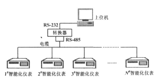 基于組態(tài)王和VB的智能化儀表監(jiān)控系統(tǒng)的結構如圖1所示。由圖1可知,該系統(tǒng)由上位計算機、RS2232 /485通信電纜和現(xiàn)場各種智能化儀表構成,該系統(tǒng)采用的是一對多的通信鏈接形式,即現(xiàn)場多種智能化儀表掛接在RS2485 總線上,然后再由RS2232 /485轉換器轉換后,連接到上位計算機。