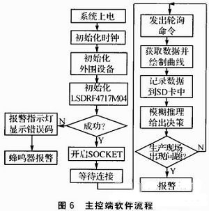 詢,以獲取實時的環境信息,并且根據這些信息進行一些簡單的計算,判斷所取得的數據是否合理,如果合理則記錄到存儲器中。分支監測點每次輪詢完成將查看是否通過LSDRF4717M04模塊接收到了主控終端的"傳送"命令,如果接收了則把存儲的環境數據發送給主控終端,否則進行下一次輪詢。分支監測點的軟件流程如圖5所示。