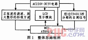 本系統(tǒng)采用AT89S52單片機(jī)作為控制核心,把經(jīng)處理的被測(cè)信號(hào)(單片機(jī)30腳輸出經(jīng)CD4013分頻的自測(cè)信號(hào))給單片機(jī)(P3.4端),再由單片機(jī)處理,通過LCD顯示模塊顯示測(cè)得的頻率值,所有的系統(tǒng)均由AC220V-DC5V底紋波電源模塊供電。整體設(shè)計(jì)思路可用框圖1表示,該設(shè)計(jì)包括4大模塊:1)系統(tǒng)控制模塊;2)低紋波電源模塊;3)分頻自測(cè)模塊(外界信號(hào)采集模塊);4)液晶顯示模塊。