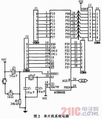 系統(tǒng)控制采用的是一種高性能低功耗的工藝制造的8位CMOS微控制器AT89S52單片機(jī),它提供下列標(biāo)準(zhǔn)特征:4K字節(jié)的程序存儲(chǔ)器,128字節(jié)的RAM,32條I/O線,2個(gè)16位定時(shí)器/計(jì)數(shù)器,一個(gè)5中斷源兩個(gè)優(yōu)先級(jí)的中斷結(jié)構(gòu),一個(gè)雙工的串行口,片上振蕩器和時(shí)鐘電路,單片機(jī)系統(tǒng)電路如圖2所示。