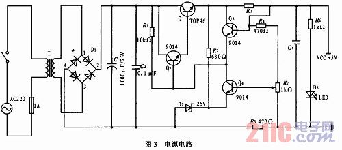 本系統(tǒng)電源完全采用220 V交流電,經(jīng)過二極管橋式整流和電容濾波,再由9014和TOP46協(xié)同確保較大且穩(wěn)定的電流。由R2、D2、Q4等確保5 V電壓,并且系統(tǒng)內(nèi)部有過流保護(hù),保證輸出電流不會(huì)超過最大允許值。輸出電流達(dá)到允許的最大值,它就會(huì)自動(dòng)減小輸出電流。它內(nèi)部有工作區(qū)限制,使穩(wěn)壓器的工作不進(jìn)入非安全區(qū)(輸出管的管壓降和輸出電流小于規(guī)定值)。最終輸出波紋小于4 MV的5 V電壓,確保了在測(cè)試頻率時(shí)不受電源的影響,電源電路如圖3所示。