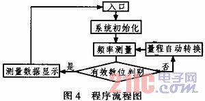 根據(jù)設(shè)計(jì)原理其工作過程就是直接用十進(jìn)制數(shù)字顯示被測(cè)信號(hào)頻率的一種測(cè)量方法。為了做到測(cè)試和讀數(shù)方便,本設(shè)計(jì)讓其做到自動(dòng)換擋,即在每個(gè)檔位(Hz、kHz)端設(shè)計(jì)了一個(gè)標(biāo)準(zhǔn)頻率(如100Hz)。在對(duì)信號(hào)測(cè)量時(shí),直接由單片機(jī)采樣并與標(biāo)準(zhǔn)頻率相比較,劃分檔位區(qū)間,在輸出顯示。本設(shè)計(jì)中主要程序流程如圖4所示。