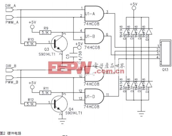 使用該單片機具有PWM功能的PB1和PB2連接PWM_A和PWM_B,使用兩個普通引腳連接DIR_A和DIR_B即可實現對電機的控制。原理說明如下:電機的A、/A、B、/B分別對應四輸入與門電路的3、6、8、11引腳。在DIR_A和DIR_B為低電平時,門電路的1、9引腳為0狀態,三極管Q3、Q4截止,門電路的4、12引腳由于上拉處于1狀態,這樣,與門電路的3、8輸出為0,即A、B為0;此時與門電路的6、11輸出與PWM_A和PWM_B保持一致,即/A、/B由PWM_A和PWM_B決定。在其他狀態下,也具有同類特點:A和/A之間、B和/B之間的通電極性由DIR_A和DIR_B決定;A和/A之間、B和/B之間的電流大小由PWM_A和PWM_B的占空比決定。而且只要三極管Q3、Q4工作正常,與門電路就不會出現邏輯混亂的情況。
