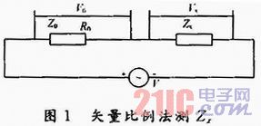 系統(tǒng)采用矢量比例法測量RLC的方法,如圖1所示。圖中參考阻抗用標準阻抗R0代替Z0,可推導出: