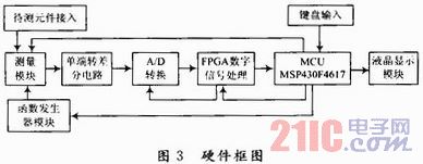 測量儀的硬件由MCU模塊、FPGA數據處理模塊、A/D采樣模塊、單端轉差分模塊、測量接入模塊、函數發(fā)生器模塊、鍵盤模塊、液晶顯示模塊構成,硬件框圖如圖3所示。