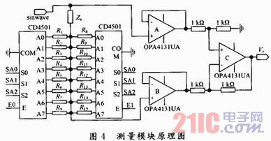 測量模塊是待測元件與標準R0分壓部分,主要包括減法電路求Vx、減法求V0電路以及標準電阻R0選擇電路,如圖4所示。由于圖2中的Vx不便直接測量,所以通過減法電路來求Vx。當圖4減法電路求得Vx的同時,也引入了新的環(huán)境變量,因此,使V0也通過相同的電路環(huán)境以減小系統(tǒng)誤差。可以分析得出,當圖1中Vx/V0為1:1時測量精度最高,所以需要調整R0與待測元件的分壓接近1:1來保證測量精度。標準電阻R0