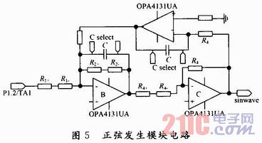 圖中電路實質是雙二次帶通濾波器,它的特點是調整過程十分簡單,增益由改變R1調整,Q由改變R2調節(jié),而改變R3則影響輸出頻率。單片機輸出方波信號從圖5中R1輸入后,經雙二次帶通濾波器濾波后輸出正弦信號。系統(tǒng)通過單片機控制的雙刀雙擲模擬開關CD4052選擇不同的電容C來實現測量頻率的自動切換。此外,為了減小溫度影響,電路中R1,R2,R3采用由正負溫度系數電阻按一定比例串聯(lián)的溫度補償設計。