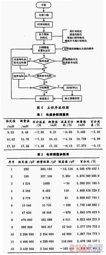 主程序設計流程為開始后先進性初始化,關閉看門狗以防止程序初始化時被復位,將系統(tǒng)時鐘初始化,接著是對各模塊(指針、液晶、鍵盤掃描、模擬開關端口)等子系統(tǒng)指針初始化,然后進入測量調整階段。測量調整階段先進行鍵盤掃描(鍵盤掃描主要用在調試階段最終不需要鍵盤輸入)設置標志位,設置定時器控制輸出方波頻率并根據鍵盤標志位判斷是否需要進行手動頻率切換,控制模擬開關自動選擇參考電阻,通知FPGA進行信號處理,并根據初步測量結果進行頻率和R0調整,對測量結果進行修正,最終控制液晶輸出測量結果。主程序設計流程圖如圖6所示。