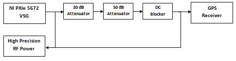 完整的 GPS 量測系統亦應包含多種不同配件,以達最佳效能。舉例來說,外接的固定式衰減器 (Attenuator),可提升功率精確度與噪聲層 (Noise floor) 的效能。此外,根據接收器是否支持其直接輸入埠的 DC 偏壓 (Bias),某些接收器亦可能需要 DC 阻絕器 (Blocker)。下圖即為 GPS 訊號產生的完整系統: