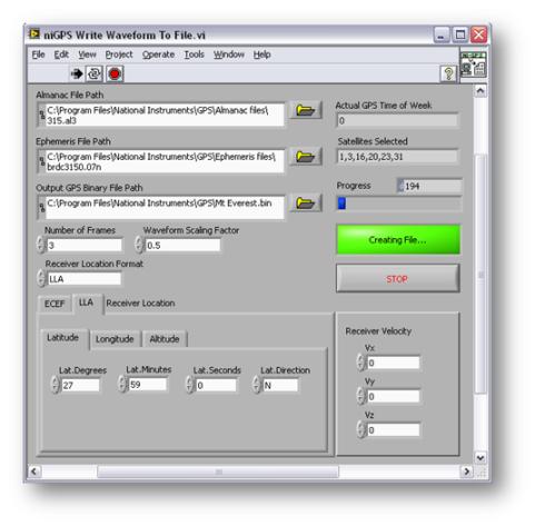 由于 GPS 接收器是透過天線傳輸數據,并取得衛星星歷與星歷信息;當然,仿真的 GPS 訊號亦需要該項信息。衛星星歷與星歷信息,均透過文本文件表示,可提供衛星位置、衛星高度、機器狀態,與繞行軌道的相關信息。此外,在建立波形的過程中M,亦必須選擇客制參數,如星期時間 (TOW)、位置 (經度、緯度、高度),與仿真的接收器速率。以此信息為基礎,工具組將自動選擇最多 12 組人造衛星、計算所有的都卜勒位移 (Doppler shift) 與虛擬距離 (Pseudorange) 信息,并接著產生所需的基頻波形。為了可盡快入門,工具組安裝程序亦包含范例的衛星星歷與星歷檔案。此外,更可由下列網站直接下載: