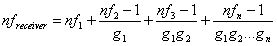 當執行串聯式噪聲系數計算時,必須先行針對每筆噪聲系數與增益,將之轉換為線性等式;即所謂的「噪聲因子 (Noise factor)」。當以串聯的 RF 組件計算系統的噪聲系數時,即可先找出系統的噪聲因子,并接著轉換為噪聲系數。因此系統的噪聲系數必須使用下列等式計算之: