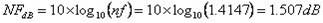 若要將噪聲因子轉換為噪聲系數 (單位為 dB),則可套用等式 3 以獲得下列結果: