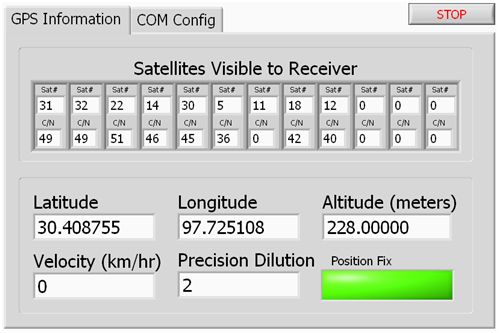 一旦我們完成 GPS 訊號的記錄作業,即可透過相同的測試數據重復測試接收器。在下方的說明中,我們追蹤接收器的經度、緯度,與速度。透過串行端口與每秒 1 次的 NMEA-183 指令讀取速率,從接收器讀取所需的數據。在下方量測中,我們所呈現的接收器特性參數,僅有定位與衛星 C/N 值。請注意,在執行這些量測作業的同時,亦可分析其他信息。雖然下列結果中并未量測水平精確度衰減 (Horizontal dilution of precision,HDOP),但此特性參數亦可提供大量的接收器定位精確度信息。