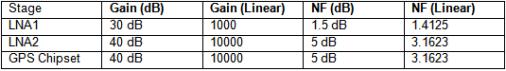 若要計算已記錄 GPS 訊號的總噪聲量,只要找出整體 RF 前端的噪聲系數即可。就一般情況來說,整組系統的噪聲系數,往往受到系統的第一組放大器所影響。在所有 RF 組件或系統中,噪聲系數均可視為 SNRin與 SNRout(參閱:量測技術的噪聲系數) 的比例。當記錄 GPS 訊號時,必須先找出整體 RF 前端的噪聲系數。