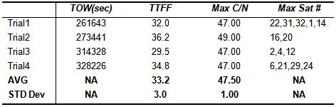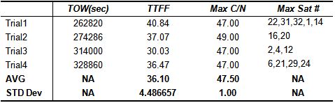 而播放訊號的功率強度,亦可達到與實時訊號相同的 C/N 值,進而確定其所得的 TTFF 與位置精確度,將可與實時訊號產生相關。在下圖 21 中,我們使用的星期時間 (TOW) 值與實時「Off-the-air」訊號的 TOW 相近,而在 4 次不同的實驗下得到 TTFF 結果。