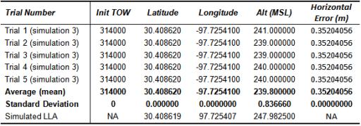 從圖 21 與 22 中可注意到,其實透過已記錄的 GPS 訊號,即可得到合理的可重復 TTFF 與 LLA (Latitude、Longitude、Altitude) 結果。然而,由于這些量測作業的錯誤與標準誤差,僅稍微高于「Off-the-air」量測的誤差,因此幾乎可將之忽略。因為絕對精確度 (Absolute accuracy) 較高,所以可重復性亦較優于「Off-the-air」量測作業。