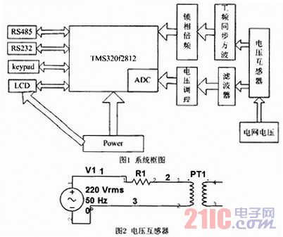 系統設計框圖如圖1所示,通過工頻同步方波電路、鎖相倍頻電路、模擬信號調理電路把電網電壓信息引入到DSP中,利用傅立葉變換對電網信息進行分析。LCD分屏顯示電網電壓波形、頻域上電壓振幅譜,通過按鍵來實現電壓波形和頻譜顯示來回切換。RS-485實現頻譜分析結果數據遠傳,RS-232接口與PC機通信,通過Windows XP操作系統超級終端訪問分析儀,對RS-485接口通信波特率、分析儀器的本機通信地址、各次諧波上限報警進行設置。