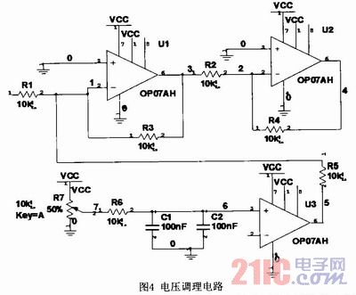 電壓互感器輸出電壓通過濾波后得到的電壓波形是-6v到+6V之間變化的正弦波,而A/D轉換器輸入電壓范圍是0~3V,所以需要通過模擬運放進行電壓調理。運放U1是加法器,而U2是反相器,U3產生基準電壓使電壓信號提高到0V以上。電壓調理電路原理如圖4所示。