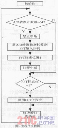 在主程序中,首先初始化DSP芯片各外設、初始化LCD顯示、分配中斷向量、開中斷、初始化看門狗(WDT)。然后在主進程中,查詢A/D采樣計數器,當數據滿64個時將它轉移到FFT輸入序列中,在轉移過程中禁止中斷,轉移完畢后FFT標志位置1。再查詢FFT標志位若滿足條件則調用FFT子程序,具體程序流程如圖6所示。