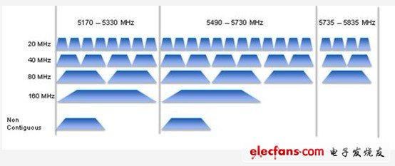802.11ac可支持5 GHz波段并強(qiáng)制包括20、40和80 MHz帶寬。支持160 MHz當(dāng)前為可選項(xiàng)。可選項(xiàng)還包括非連續(xù)80+80 MHz TX和RX帶寬。