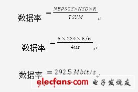以下步驟可用于計(jì)算下列配置的數(shù)據(jù)率:80 MHz帶寬、帶800 ns保護(hù)間隔的64-QAM信號(hào)以及一條空間流。基本上有234數(shù)據(jù)載波(242—8導(dǎo)頻)。符號(hào)率計(jì)算方式如下:256/80 MHz + 800 ns (GI)。將數(shù)值代入數(shù)據(jù)率公式可得: