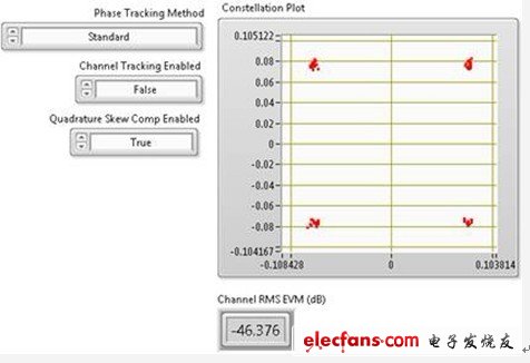 圖9. 上圖顯示了80 MHz 802.11ac信號(hào)進(jìn)行相位跟蹤對(duì)EVM數(shù)的影響。該圖表在256-QAM信號(hào)圖中僅顯示了4個(gè)符號(hào)。