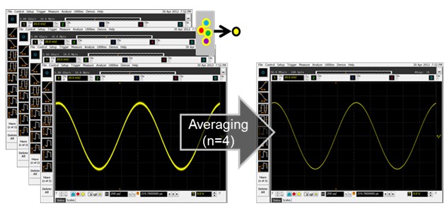 平均值模式一般通過降低噪聲使波形變細。平均值模式可使示波器進行連續采集,對每個已捕獲的點求平均值,如圖 5 所示。這種方法通過多次采集求取噪聲平均值,能夠降低示波器整體噪聲。平均值權衡包括:平均值法還會求取目標信號值的平均值,并且僅針對重復信號。