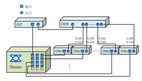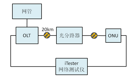 使用iTester網(wǎng)絡(luò)測(cè)試儀進(jìn)行XPON系統(tǒng)測(cè)試時(shí),需將OLT接入網(wǎng)絡(luò)測(cè)試儀的一個(gè)端口,將剩余ONU設(shè)備分別接入網(wǎng)絡(luò)測(cè)試儀的其余端口。