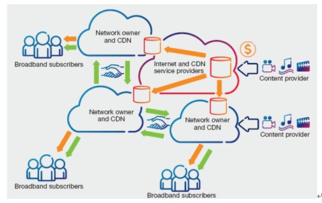 • 運營商與運營商間的網際對接 – 多個內容交付網絡通過融合或合作,成為單一的內容交付網絡。從內部運營角度看,多個內容交付網絡在使用信息收集和交叉收費模式上,與目前移動運營商漫游業務模式大致相同。該合作模式使內容交付網絡運營商有機會爭取全球內容用戶,這些用戶可能會與各個運營商分別進行談判,最后確定與某一支持全球覆蓋的內容交付網絡簽署一份協議;