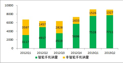 終端的智能化是當(dāng)今產(chǎn)業(yè)發(fā)展中最為明顯的一個特征。伴隨智能終端的普及,2013年第二季度我國智能手機(jī)銷量約為7711萬臺,是非智能手機(jī)銷量的5.8倍,與2012年同季度相比,增速為56.8%。如圖1所示。