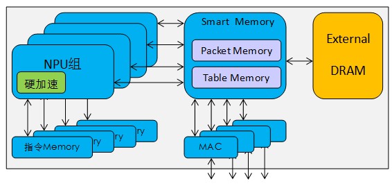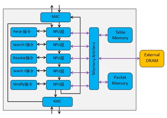 商用NP一般由五個部分組成:NPU、指令Memory、Table Memory(片內(nèi))、Packet Memory(片內(nèi))和Table DRAM(片外)。這種設(shè)計思路使每個模塊的靈活性得到了提高,但是,在實際部署業(yè)務(wù)時,需要細致地考慮如何進行業(yè)務(wù)流程切分,而每個NPU組的指令空間都是有限的,如果某個指令空間即將耗盡,則無法支持新的業(yè)務(wù)。如果業(yè)務(wù)切分不好,則會導(dǎo)致某些NPU組負載過重,產(chǎn)生業(yè)務(wù)處理瓶頸,所以實際上NP芯片的總體靈活性并沒有比ASIC提高多少,總體性能仍然不能令人滿意。
