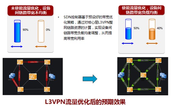通過SDN構(gòu)筑集中化管理的網(wǎng)絡(luò)能夠帶來很多好處,但首先將優(yōu)先解決現(xiàn)實(shí)中面臨的種種挑戰(zhàn)。在LTE/LTE-A的承載網(wǎng)中,城域核心層需要運(yùn)行L3網(wǎng)絡(luò),借助SDN的集中式控制和控制轉(zhuǎn)發(fā)分離,可以有效減少網(wǎng)絡(luò)部署和運(yùn)維時間,同時可以對城域L3流量進(jìn)行優(yōu)化并提升帶寬利用率。通過可視化流量APP在整個網(wǎng)絡(luò)的綜合應(yīng)用,能夠顯著提升流量經(jīng)營水平,通過流量快速調(diào)整和疏導(dǎo),實(shí)現(xiàn)整網(wǎng)流量價值的充分發(fā)揮(見下圖)。