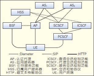 在IMS網絡中,很多應用都需要在UE與AS之間進行交互,如UE和基本補充業(yè)務服務器(MMTelAS)之間進行補充業(yè)務的激活、去激活,例如前轉類、限制類、顯示類業(yè)務設置操作。部署GBA通用認證架構能夠以統(tǒng)一的認證機制,解決UE和AS雙向認證的問題,同時增強運營商管控能力。圖2為GBA在IMS網絡中的組網示意,其中虛線是網元與HSS之間的接口,基于Diameter協(xié)議;粗實線表示GBA架構的關鍵接口,基于超文件傳輸協(xié)議(HTTP);細實線表示IMS關鍵接口,基于會話初始協(xié)議(SIP)協(xié)議。