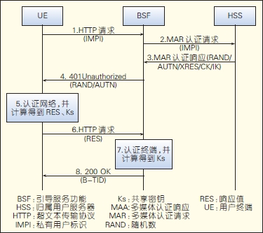 (1)執(zhí)行引導認證流程。通過AKA協(xié)議實現(xiàn)BSF與UE之間進行的雙向認證,當認證成功后,UE和BSF擁有Ks。