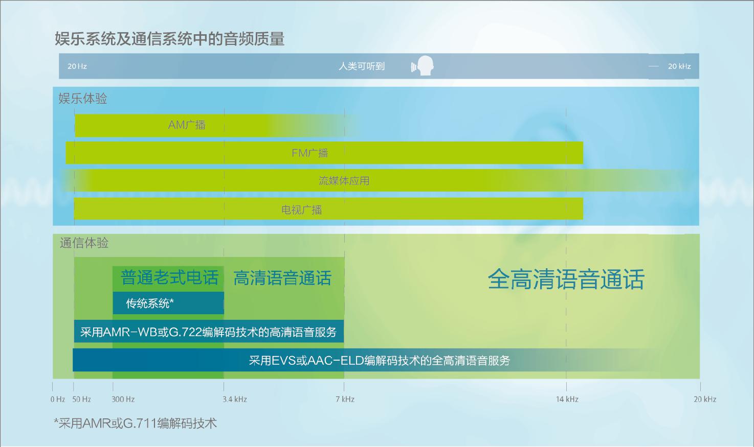 目前,由于音頻帶寬較窄及非語音信號處理水平較差等限制因素,通話服務往往無法提供高品質的聲音體驗。然而,語音和音頻編碼技術取得的最新進展將有助于大幅提升通話服務質量,通過提供全頻帶音頻傳輸實現更貼近原聲的聲音體驗,并改善語言清晰度及聆聽舒適度。