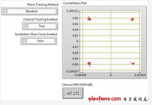 圖9. 上圖顯示了80 MHz 802.11ac信號進行相位跟蹤對EVM數的影響。該圖表在256-QAM信號圖中僅顯示了4個符號。