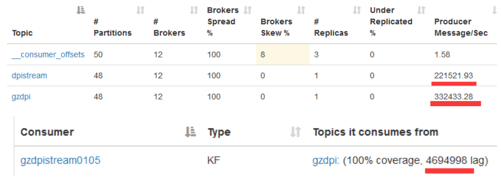 Kafka Stream消費(fèi)4GDPI的數(shù)據(jù),并行處理。在程序里設(shè)置不同的計(jì)數(shù)器,所有數(shù)據(jù)都經(jīng)過這些計(jì)數(shù)器處理,為了解決去重問題,引入了布隆過濾,雖然有一定的誤判率,但是還是能比較好的完成去重,同時(shí)保證系統(tǒng)的性能。同樣消費(fèi)者也可以通過Kafka Manager進(jìn)行管理,可以直觀觀察到消費(fèi)者的落后程度。