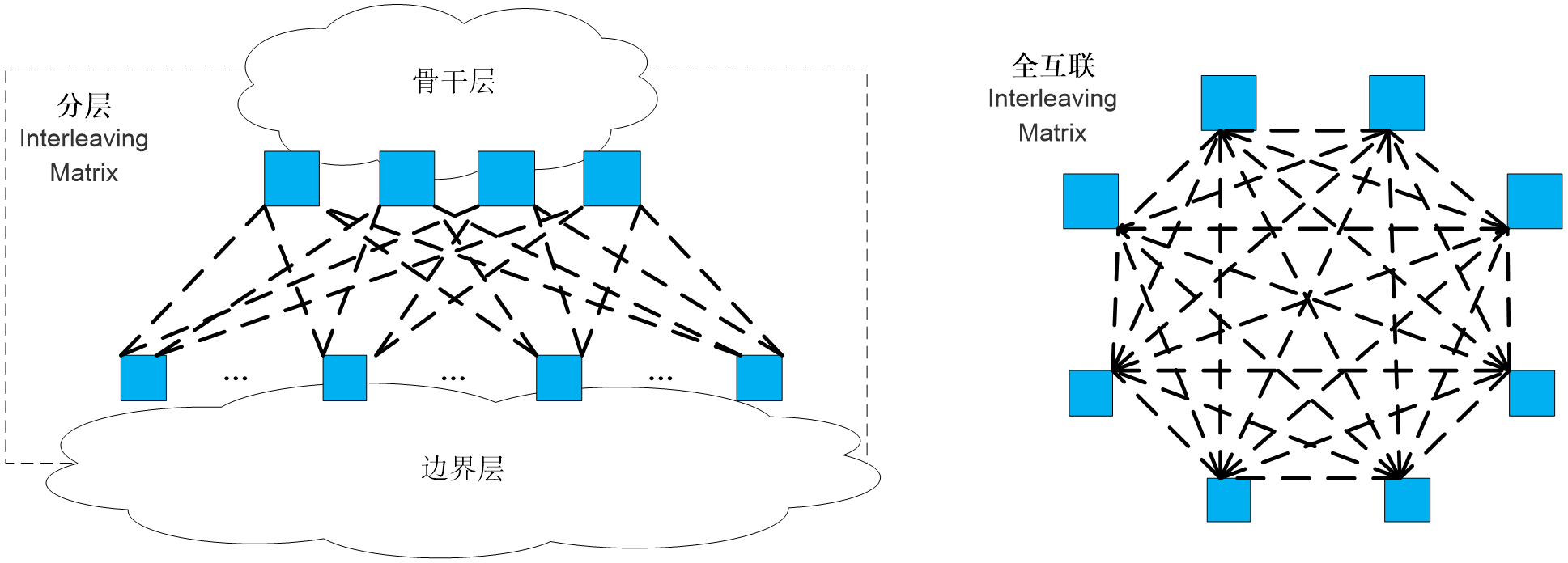 在交織矩陣網絡架構下,所有節點全互聯或分層互聯。分層結構下節點包含骨干節點和邊界節點,骨干節點與邊界節點間全連接,骨干節點僅用作轉發。在這種架構下,網絡交織形成的大量等價路徑既保證了鏈路的冗余可靠,又提高了整個網絡的吞吐量。扁平的網絡結構保證了任意節點間較高的連接速率,同時對任意類型流量均擁有極低的時延。
