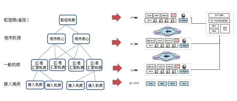 網絡DC是承載虛擬化網元和專用硬件設備的新型網絡機房,是運營商網絡重構的基礎,網絡DC目標架構仍繼續保持四層架構,與現有通信局所的層級設置保持對應關系,未來通用標準化設備高密度集成,單機架高功耗、大體積、大重量趨勢對現有機房承重、電源空調等配套提出了更大的挑戰。以中國電信網絡DC化重構為例,如圖1所示。網絡重構是以NFV(Network Function Virtualization,網絡功能虛擬化)和SDN(Software Defined Network,軟件自定義網絡)為前提的。通過虛擬化技術在通用硬件平臺上虛擬化構建計算環境,可以承載來自于運營商或者第三方的MEC應用,MEC節點可以與5G的NFV同平臺兼容部署。