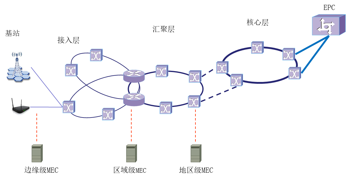 網絡重構的本質是“邊緣計算”,并強調面向“多接入邊緣計算”的單一開放平臺,MEC部署也需要根據業務的不同需求,部署在網絡合適的位置,分為邊緣級、區域級和地區級。因此MEC是應對網絡重構的一種實現方式。