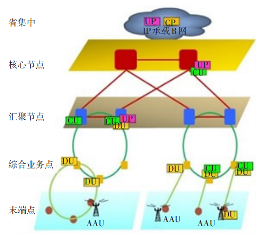 從圖3中可以看出,核心網(wǎng)CP一般采用區(qū)域(省)集中或本地集中方式設(shè)置,核心網(wǎng)UP面一般設(shè)置在地(市)核心節(jié)點,對于低時延、大容量的業(yè)務(wù)應(yīng)用視情況向匯聚節(jié)點、甚至綜合業(yè)務(wù)接入點下沉。移動網(wǎng)RAN側(cè)CU一般位于匯聚節(jié)點,時延滿足時可以設(shè)置在核心節(jié)點,也可以下沉到綜合業(yè)務(wù)接入點、基站,視不同的業(yè)務(wù)應(yīng)用場景而定。
