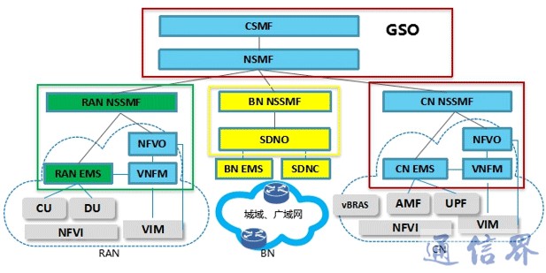 RAN、核心網、承載網三者之間的協同通過基于SDN/NFV架構的切片編排器完成,如圖2所示。其中,SDNO負責承載切片編排,并通過SDNC完成承載切片布署。而Global Orchestrator(GSO)完成無線和承載之間跨域的業務協調和編排, 可同時協調CN子切片管理(CN NSSMF)、RAN子切片管理(RAN NSSMF) 和承載網子切片管理(BN NSSMF), 從而實現5G業務的端到端切片,并通過各切片的不同功能屬性滿足5G業務的差異化需求。